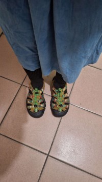 戴帽藍迷彩外套、皮鞋、奇威冬褲