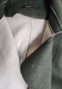 您好:這款墨綠色風衣式大衣,裡布米色,